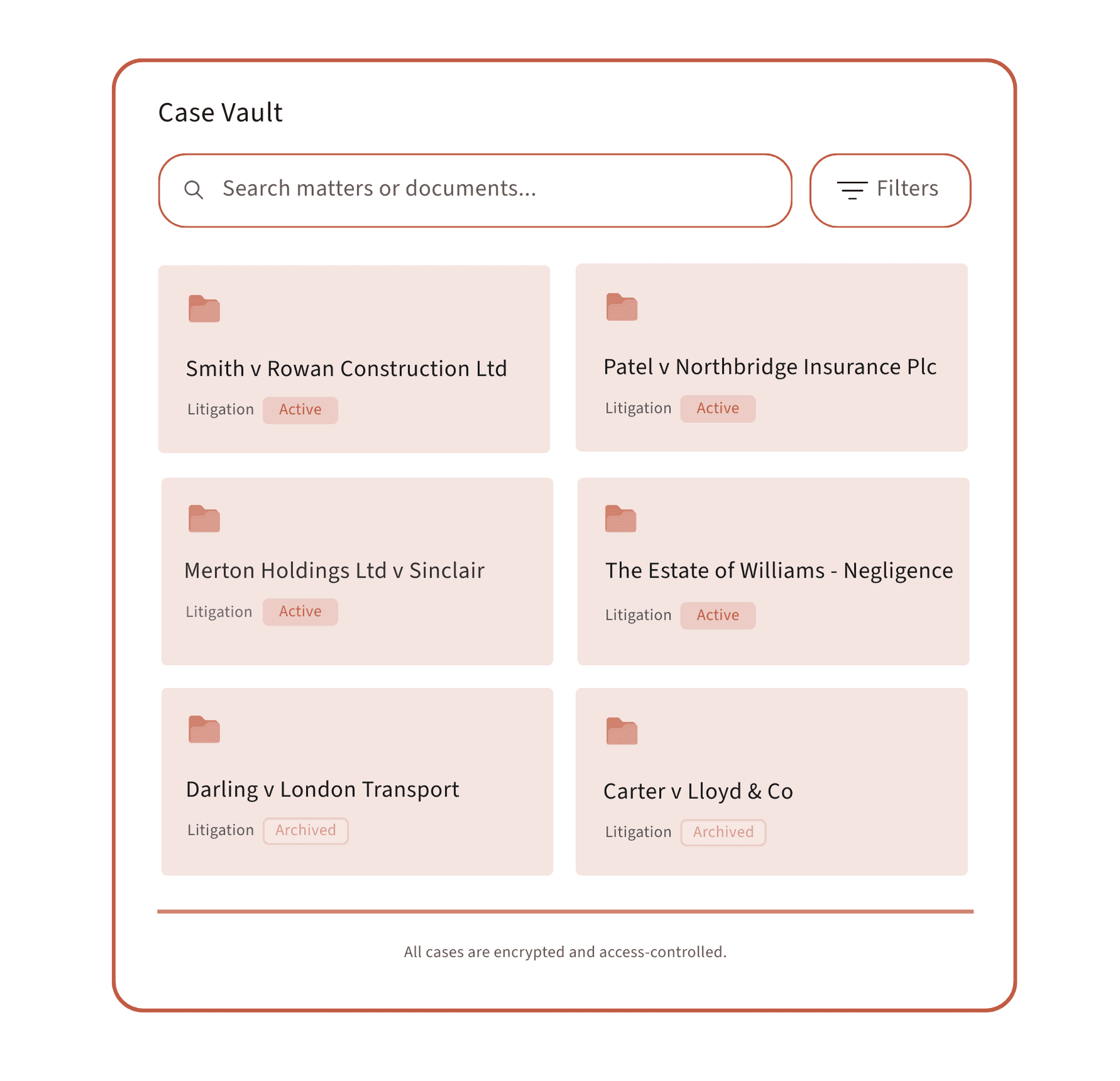 Each matter is stored in a personal, encrypted vault tied to the lawyer’s account.
